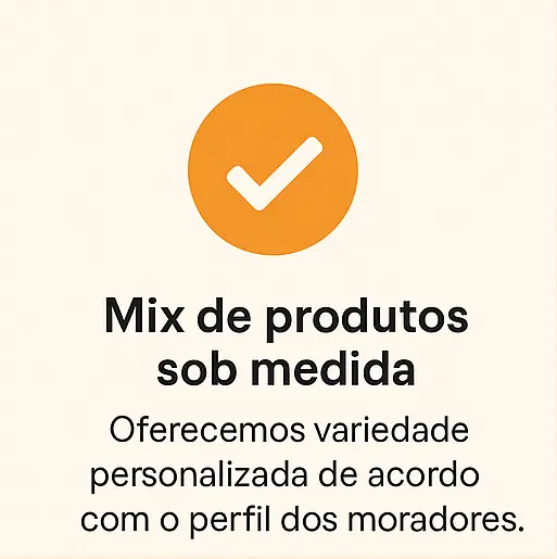 Com um layout moderno e modular, o minimercado funciona em espaços a partir de 2m², sem necessidade de mão de obra, e com um portfólio personalizado: bebidas, snacks, refeições, produtos de higiene, limpeza e muito mais — tudo disponível 24 horas, todos os dias.